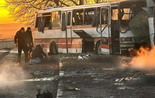 El autobús atacado por un dron ruso en las inmediaciones de Ternivka, en la región de Dnipropetrovsk, donde murieron al...