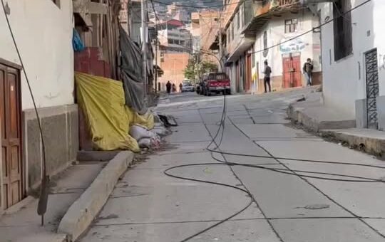 Vecinos y transeúntes en Cajamarca alertan sobre cables caídos en la intersección de Jr. Guillermo Urrelo con la Av. Perú,...