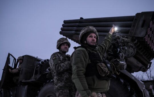 Los militares de la 24ª Brigada Mecanizada Separada de las Fuerzas Armadas de Ucrania disparan un sistema de lanzamiento de...