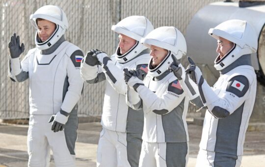 Astronautas de la misión Crew-11. De izquierda a derecha: Oleg Platonov, Mike Fincke, Zena Cardman y Kimiya Yui. Foto: AFP....