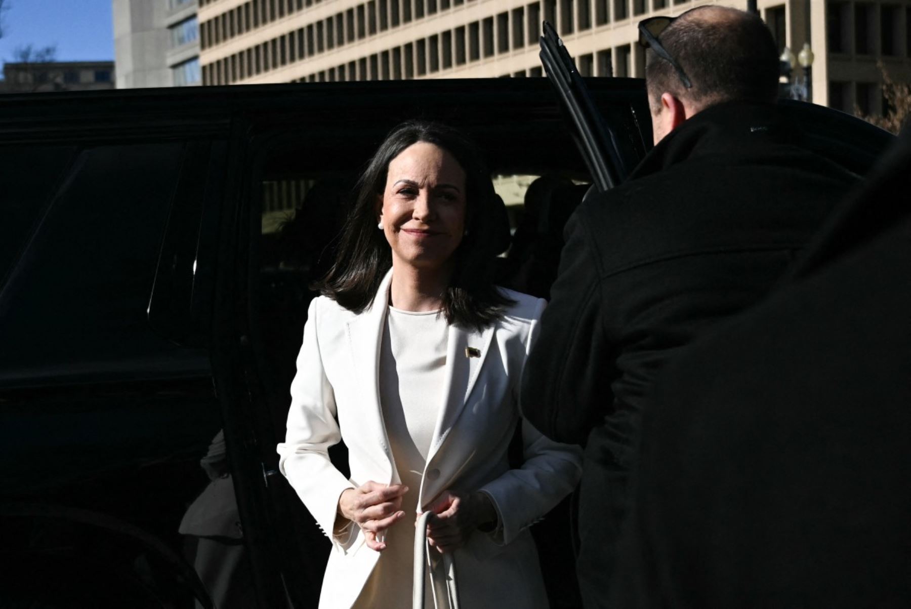 Vestida con un traje chaqueta blanca, Machado llegó a la entrada exterior del recinto de la Casa Blanca a bordo de un auto.