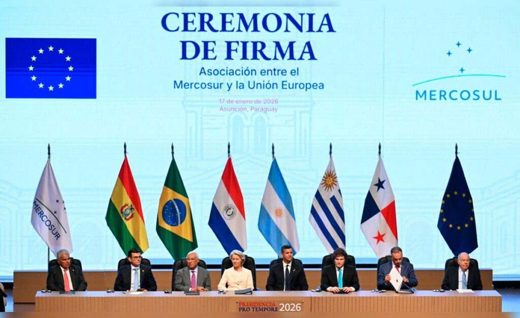 Después de más de dos décadas de intensas negociaciones, el Mercosur y la Unión Europea firmaron este sábado un histórico tratado de libre comercio en una ceremonia celebrada en el Gran Teatro José Asunción Flores, en Asunción, Paraguay. El evento contó con la presencia del presidente anfitrión Santiago Peña, el presidente de Uruguay Yamandú Orsi, el presidente de Argentina Javier Milei, el canciller de Brasil Mauro Vieira, y la presidenta de la Comisión Europea, Ursula von der Leyen, acompañados de otras destacadas autoridades regionales y europeas.