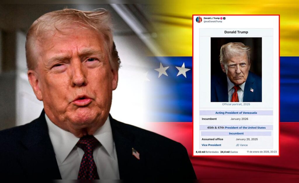 El presidente Donald Trump generó una nueva ola de controversia al publicar en su red social Truth Social una imagen manipulada de su supuesto perfil en Wikipedia en la que aparece con el título de “presidente interino de Venezuela”, con fecha de inicio de enero de 2026. La propia foto fue realizada con edición digital y no corresponde a ninguna actualización real, que sigue mostrando su cargo auténtico como mandatario de Estados Unidos.